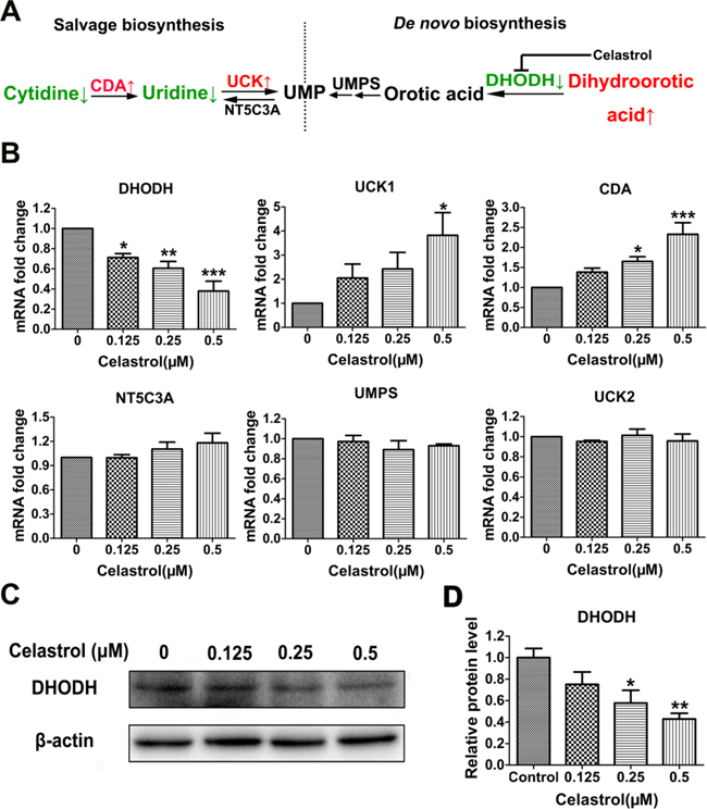 Figure 5: The screening of target metabolic enzyme gene expression affected by celastrol. A. Schematic overview of pyrimidine biosynthesis. B. The mRNA levels of candidate enzyme genes involved in the metabolism of pyrimidine. CDA: cytidine deaminase, EC 3.5.4.5; UCK: uridine-cytidine kinase, EC 2.7.1.48; NT5C3A: 5′-nucleotidase, cytosolic IIIA, EC 3.1.3.5; UMPS: uridine monophosphate synthetase, EC 2.4.2.10 and EC 4.1.1.23;DHODH, dihydroorotate dehydrogenase, EC 1.3.3.1. C. Western blot was utilized to validate the protein level of the target enzyme gene. D. The integrated option intensity of target protein band was quantified by Image-Pro Plus software. Results represent three independent experiments performed in triplicate. Asterisks indicate statistical significance (*p < 0.05, **p < 0.01, ***p < 0.001).