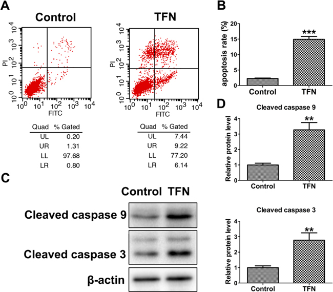 Figure 6: The pro-apoptotic effect of Teriflunomide (TFN, a specific inhibitor of DHODH) on HL-60 cells. A. and B. HL-60 cells were treated with 0.1% DMSO (control) and 200 μM TFN for 24 h. Flow cytometry analysis was performed to determine the apoptosis rate. C. and D. Western blot analysis showed Teriflunomide (200 μM) increased cleaved caspase 9 and cleaved caspase 3 protein levels in HL-60 cells. Asterisks indicate statistical significance (**p < 0.01, ***p < 0.001).