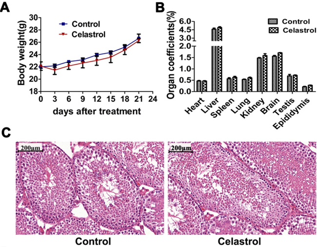 Figure 7: In vivo toxicity evaluation of celastrol. A. Body weight changes of nude mice after celastrol treatment. B. Organ coefficients of major organs including heart, liver, spleen, lung, kidney, brain, testis and epididymis. C. Optical microscopy images of testis H&E staining after celastrol treatment. Scale bar: 200 μm. Magnification, ×10.