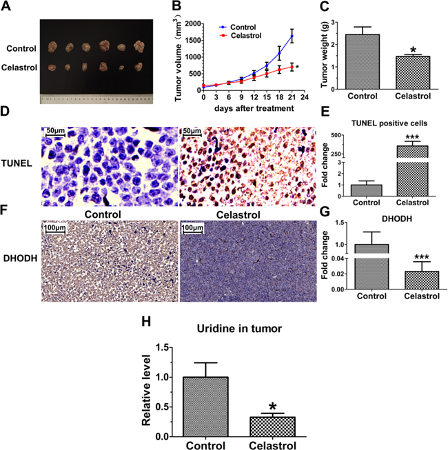 Figure 8: In vivo efficacy evaluation of celastrol. A. Photograph of excised tumors on Day 21 after celastrol treatment. B. Tumor growth curves of mice treated with control solvent and celastrol. C. The weight of the excised tumor masses from control and celastrol treatment groups. Data expressed as means±SEM (n=6). D. Images from TUNEL assay. Scale bar: 50 μm. Magnification, ×40. E. Statistical comparison of apoptotic cells in tumor tissues from control and celastrol treatment group. F. Immunohistochemistry analysis of DHODH protein level in the tumor tissues with or without celastrol treatment, Scale bar: 100 μm. Magnification, ×20. G. The integrated option density of the images from immunohistochemistry analysis was quantified by Image-Pro Plus software. H. Comparison of uridine content in tumor tissues from celastrol treated and untreated groups. Asterisks indicate statistical significance (*p < 0.05, ***p < 0.001).