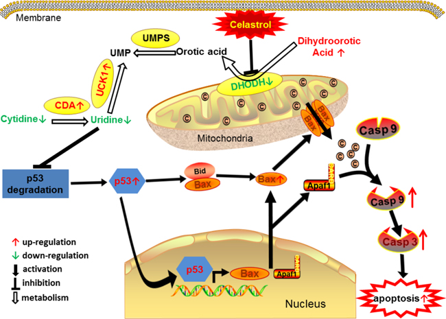 In this study, from a new perspective, we revealed a novel pathway underlying the inhibitory effect of celastrol on APL cells, namely, DHODH/UCK1/uridine/p53/mitochondrial pathway of apoptosis (Figure 9).
