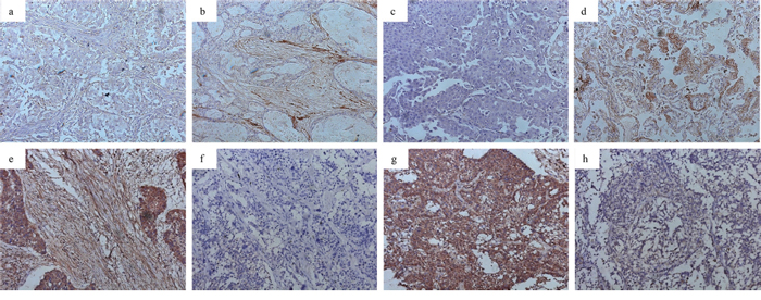 Figure 1: Expression of miRNA-200a and HGF in NSCLC (magnification ×200). a. low miRNA-200a in stromal fibroblasts; b. high miRNA-200a in stromal fibroblasts; c. low miRNA-200a in cancer cells; d. high miRNA-200a in cancer cells; e. high HGF expression in stromal fibroblasts; f. low HGF expression in stromal fibroblasts; g. high HGF expression in cancer cells; h. low HGF expression in cancer cells.