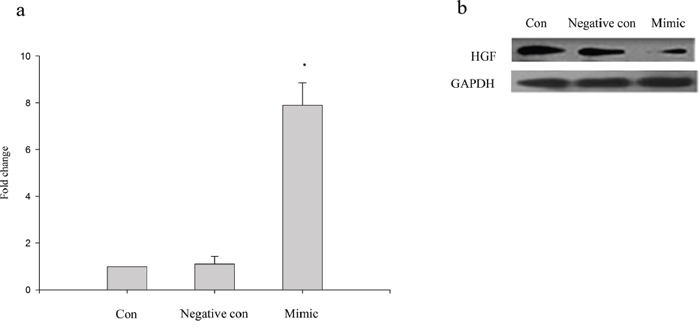 Figure 2: Expression of target gene HGF of miRNA-200a. a. Real-time PCR analysis of miRNA-200a expression in human CAFs. Human CAFs transfected with miRNA-200a mimics and negative controls. The results indicated that miRNA-200a expression in higher in cells treated with miRNA-200a mimics; b. Western blotting analysis of CAFs treated with miRNA-200a mimics. Upregulation of miRNA-200a reduced expression of HGF.