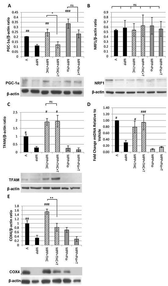 The transcription factor nuclear respiratory factor 1 (NRF1) regulates the expression of nuclear encoded mitochondrial genes and is transcriptionally regulated by PGC-1α [28]. No changes were detected in NRF1 expression with 7 mM MPP+, 10 µM Δ9-THC or 5 µM pioglitazone treatment (Figure 2B).