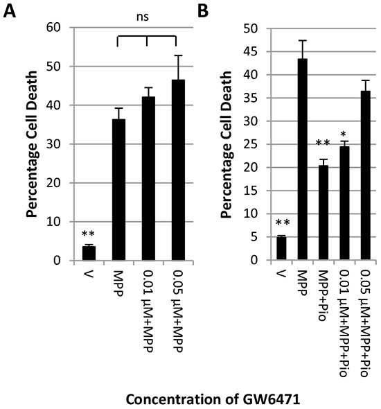 The evidence presented here indicates that pioglitazone may not act exclusively through the PPARγ receptor. Pioglitazone has been shown to activate the human PPARα receptor [29]. We therefore tested whether the specific PPARα receptor antagonist GW6471 could reverse the protective effect of pioglitazone. The LDH assay in Figure 4A shows that GW6471 at concentrations of up to 0.05 µM did not increase MPP+ toxicity. Furthermore, 0.05 µM GW6471 reversed pioglitazone mediated neuroprotection against MPP+ (Figure 4B).