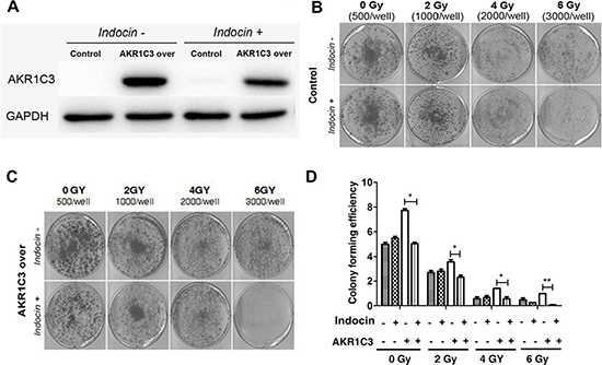 Figure 2: Indomethacin, an inhibitor of AKR1C3 activity, overcomes radiation resistance. (A) AKR1C3-over cells and control cells were treated with or without 20 mmol/ indomethacin for 2 days, and western blotting was performed; (B, C) AKR1C3-over cells and Control cells were treated with or without 20 mmol/ indomethacin for 2 days, and clonogenic assay was performed; (D) Colony forming efficiency were calculated and results are presented as means SD of two experiments performed in duplicate.