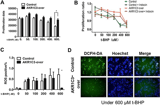 Figure 3: Mechanistic exploration of AKR1C3 as a cellular factor for protecting cells from irradiation damage. (A) Control and AKR1C3-over cells were treated with a series concentration of t-BHP or DMSO for 1 h followed by cell proliferation assessment by CCK-8 assay. Data presented is the average of three experiments (SD), *P < 0.05, **P < 0.01. (B) AKR1C3-over cells ,control cells, AKR1C3-over cells pretreated with 20 mmol/ indomethacin for 2 days and control cells pretreated with 20 mmol/ indomethacin for 2 days were treated with a series concentration of t-BHP or DMSO followed by cell proliferation assessment by CCK-8 assay. Data presented is the average of three experiments (SD), *P < 0.05, **P < 0.01. (C) Quantifications of the ROS levels in Control and AKR1C3-over cells prior to and 1 h after 600 μM t-BHP treatment . Data presented is the average of three experiments (SD), *P < 0.05, **P < 0.01. (D) Representative microscopic view of the accumulation of ROS in Control and AKR1C3-over cells stained by DFCH after 600 μM t-BHP treatment.