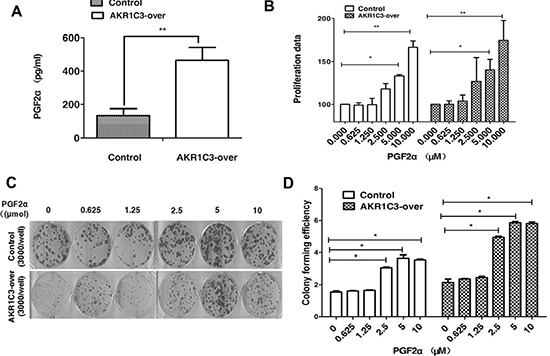 Figure 4: Overexpression of AKR1C3 in DU145 cells increases the amount of PGF2α. (A) Overexpression of AKR1C3 in DU145 cells increases the amount of PGF2α. Cells were treated with 6 GY radiation and the concentration of PGF2α in supernatants was measured by ELISA for the indicated times (n = 2). *P < 0.05, **P <0.01. (B) The effects of PGF2α itself on cell proliferation: Control and AKR1C3-over cells were treated with the indicated concentration of PGF2α or DMSO for 6 days followed by cell proliferation assessment by CCK-8 assay. Data presented is the average of three experiments (SD), *P < 0.05, **P < 0.01. (C) The effect of PGF2α on cell radiationresistance was determined by clonogenic assay. The number of colonies formed in the wells increased as the PGF2α concentration increased. (D) Colony forming efficiency were calculated and results are presented as means SD of two experiments performed in duplicate.