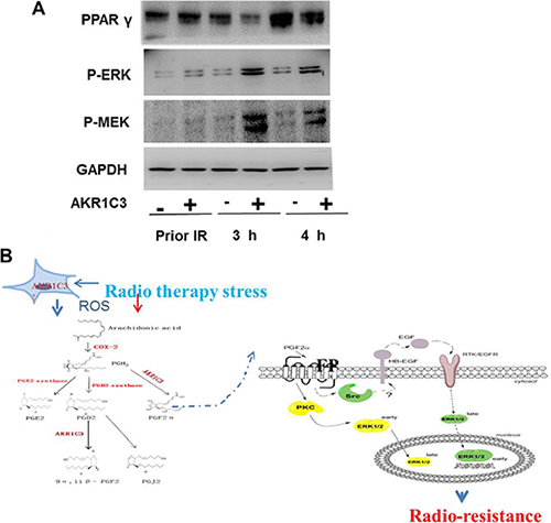 In our experiment we used DU145 cells to generate a cell line that stably overexpresses AKR1C3 by means of retroviral infection. The DU145 cell line was infected with either AKR1C3 overexpressing retroviral construct (AKR1C3-over) or with anempty vector (Control). The levels of AKR1C3 overexpression in AKR1C3-over cells was confirmed by Western blot analysis (Figure 1A). Cell clone experiments confirmed AKR1C3 overexpressing DU145 cells are resistant to radiation (Figure 1B–1C), And Suppression of AKR1C3 via its chemical inhibitor indocin restored the sensitivity of the acquired tumor cells (Figure 2A–2D). AKR1C3 can alleviate oxidative stress (Figure 3A–3D). Also overexpression of AKR1C3 can resulted in the accumulation of prostaglandin F2α (Figure 4A). Then, the effect of PGF2α on radiation resistance was evaluated by colony formation assay. The number of colonies formed in the wells increased as the PGF2α concentration increased (Figure 4C–4D). This resistance to radiation suggests that AKR1C3 overexpression in DU145 may protect tumors from the antiproliferative effects mediated by this PG. At last, we measured its key downstream pathway.Western blotting results show that PGF2α augmenting the MAPK signaling pathway and inhibit the activitiation of PPARγ (Figure 5A).