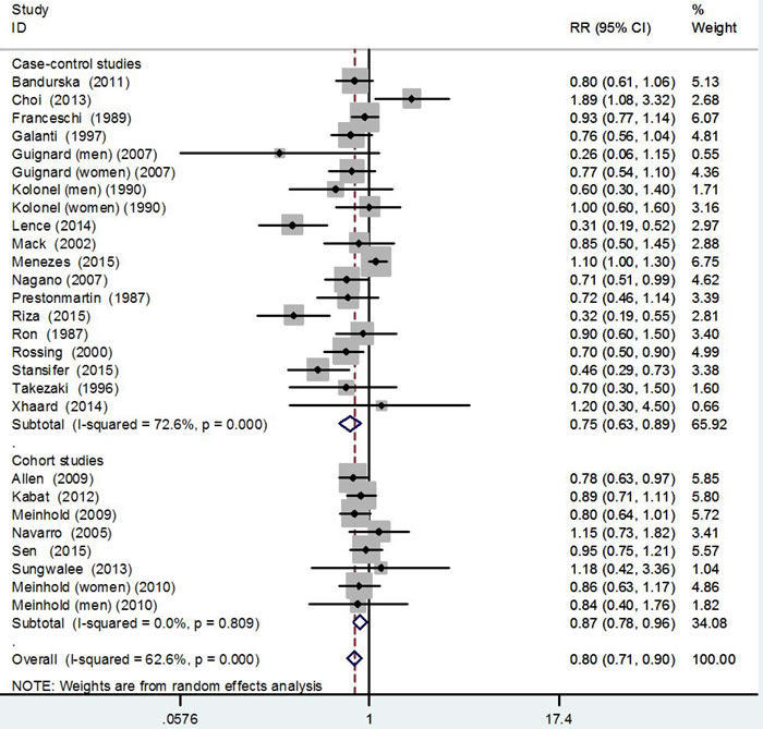 A significant risk difference for thyroid cancer was observed in different geographic areas. The beneficial effect of alcohol intaking on thyroid cancer was found in European (RR = 0.77, 95%CI: 0.65-0.92) and American studies (RR = 0.79, 95%CI: 0.67-0.93), but not in Asian studies (RR = 1.01, 95%CI: 0.58-1.75). This might be due to the different alcohol beverages, different lifestyles and the difference of functional variants in gene involved in alcohol metabolism, such as single nucleotide polymorphisms in ADH1B and ALDH2, among various ethnic groups [48]. The gene polymorphisms involved in alcohol metabolism have been related to the risk of selected cancers [49-51]. However, there is lack of data on their role on thyroid cancer.