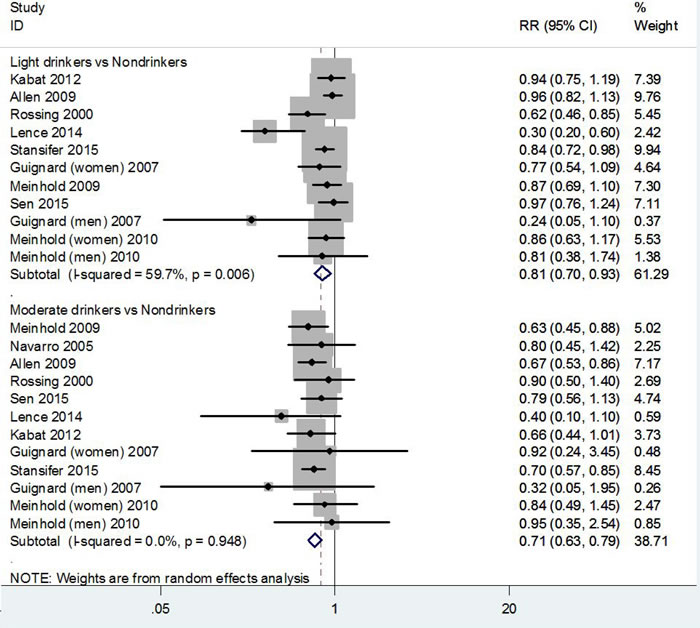 The expression of alcohol intake was various in different studies; therefore, we used grams of ethanol per day as a standard measure and defined one drink as 12.5 g of ethanol, 1 ml of alcohol as 0.8 g and 1 ounce as 28 g. Nondrinkers drinkers were defined as the reference category. Since the highest category of alcohol exposure was set at > 1 drinks/day in the majority of studies, thus we divided the alcohol drinker into two levels: light drinker defined as ≤1 drink/day (≤12.5 g/day of ethanol) and moderate as >1 drinks/day (>12.5 g/day of ethanol). When a study provided a series of categories of alcohol consumption, we used the midpoint of each category as the corresponding exposure dose. For the upper open-ended category, the exposure dose was calculated as 1.2 times its lower bound [24]. When the estimates for drinkers versus nondrinkers was not presented in a study, we combined the corresponding risk estimates associated with different alcohol exposure categories using the method proposed by Hamling et al [25] when possible. Similar methods were adopted for light and moderate drinker when more than one exposure categories fell in one of these levels. When a study didn’t used nondrinkers as a reference category, the RRs and 95% CI were recalculated using the nondrinkers as reference by the method proposed by Orsini et al [26].