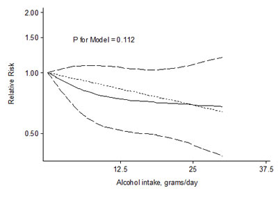 Figure 3: Relative risks (RRs) and the corresponding 95% confidence intervals (CIs) for the dose-response relationship between alcohol drinking (grams per day) and thyroid cancer risk. The solid line and the long dash line represent the estimated RRs and their 95% CIs. Short dash line represents the linear relationship.