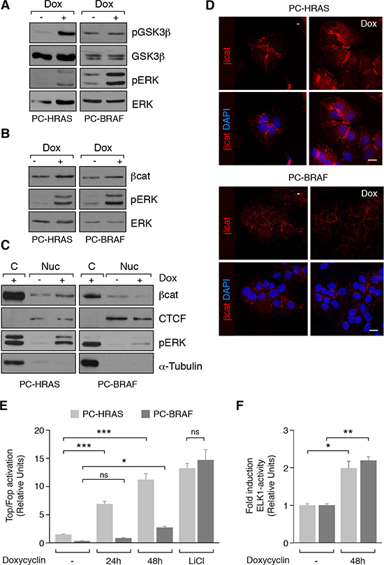 Figure 1: Wnt/β-catenin activation in PCCl3 cells conditionally expressing HRASV12 (PC-HRAS) or BRAFV600E (PC-BRAF). PC-HRAS and PC-BRAF cells were starved for 48 h and then treated with doxycycline for the times indicated. (A and B). Total proteins extracts were analyzed by western blot for the detection of p-GSK3β (panel A) and β-catenin (βcat) (panel B). (C) Nuclear (Nuc) and cytoplasmic (C) protein extracts were analyzed by western blot for the detection of β-catenin. CTCF and β-tubulin were used as nuclear and cytoplasmic loading controls, respectively. (D) Cells were grown on cover-slips, fixed and stained with a β-catenin antibody (red). Nuclei were stained with DAPI (blue). Scale bar 10 μm. (E) β-catenin transcriptional activity was measured in cells transfected with Super8x TopFlash (Top) or Super8x FopFlash (Fop) vectors after 24 and 48 h of doxycycline treatment or 48 h of LiCl treatment. Data show fold induction of the Top/Fop ratio with respect to non-treated cells (−). (F) ELK-1 activation was measured in cells transfected with the reporter vector pGE51-luc, encoding the transactivation domain of Elk-1 (amino acids 307 to 428) fused to the GAL4 DNA-binding domain, and a pRL-CMV Renilla construct, after 48 h in the presence (+) or absence (−) of doxycycline. Data show fold induction of ELK-1 activation relative to Renilla levels. Values represent means ± SEM (n = 3). *p < 0.05; **p < 0.01; *** p < 0.001.