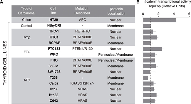 Figure 2: β-catenin subcellular localization and transcriptional activity in a panel of human thyroid cancer cell lines. (A) Table summarizing classification, mutations described and β-catenin localization in different thyroid cell lines. β-catenin localization was analyzed by immunocytochemistry and confocal imaging as shown in Supplementary Figure 1. (B) β-catenin transcriptional activity was measured in Super8x (Top) or Super8x FopFlash vector-transfected cells. Data show fold induction of the Top/Fop ratio with respect to non-treated cells (−). Values represent means ± SEM (n = 3).