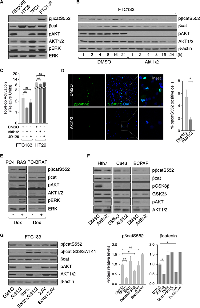 Figure 3: PI3K/AKT signaling controls β-catenin expression through its phosphorylation at serine 552. (A, B) β-catenin and pβ-cateninS552 expression levels were analyzed by western blot in the indicated cell lines and in FTC133 cells treated with DMSO or with Akti1/2 for the specified times. (C) β-catenin transcriptional activity was analyzed in FTC133 and HT29 cells after treatment with DMSO, Akti1/2 or UO126 for 24 h. Data show fold induction of the Top/Fop ratio with respect to non-treated cells (−). Values represent means ± SEM (n = 3). *p < 0.05; **p < 0.01; ***p < 0.001. (D) FTC133 cells were grown on cover-slips, treated with DMSO or Akti1/2 for 24 h, fixed and stained for pβ-cateninS552 (green). Nuclei were stained with DAPI (blue). Scale bar 25 μm. The insets show higher magnifications of the regions marked by a square. (E) PC-HRAS and PC-BRAF were starved for 48 h and then treated with doxycycline for 48 h. Total protein extracts were analyzed by western blot for pβ-cateninS552. (F) The indicated cell lines were treated with DMSO or Akti1/2 and total protein extracts were analyzed by western blot for the detection of β-catenin and pβ-cateninS552. (G) Left panel: FTC133 cells were pre-treated for 1 h with bortezomib (Bortz) and then treated with DMSO, Akti1/2 or XAV939 (XAV) for 8 h. Total protein extracts were analyzed by western blot for the detection of pβ-cateninS552 and pβ-cateninS33/37/T41. Right panel: quantification of protein levels normalized to β-actin. Values represent means ± SEM (n = 3). *p < 0.05; **p < 0.01; ns not significant.