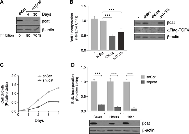 Figure 4: β-catenin inhibition decreases proliferation in human tumoral thyroid cells. (A) FTC133 cells were infected with control (shScr) or β-catenin (shβcat) lentivirus shRNAs. Total protein extracts were obtained at the indicated times and analyzed by western blot for β-catenin expression. (B) Left panel: FTC133 cells were infected with control (shScr) or β-catenin (shβcat) lentivirus shRNAs or a dominant-negative form of TCF4 [dnTCF4] and BrdU incorporation was calculated. Data show BrdU incorporation relative to that of cells infected with the vehicle vector (shScr). Values represent means ± SEM (n = 3). ***p < 0.001. Right panel: western blot analyis of TCF4 expression (C) FTC133 cells were infected with control (shScr) or β-catenin (shβcat) lentivirus shRNAs and cell growth was estimated relative to the density at day 0. Values represent means ± SEM (n = 3). (D) Cell lines were infected with control (shScr) or β-catenin (shβcat) lentivirus shRNAs and BrdU incorporation was calculated. Data show BrdU incorporation relative to that of the cells infected with the vehicle vector (shScr). ***p < 0.001.