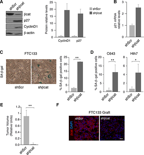 Figure 5: β-catenin inhibition induces cell senescence and reduces tumor growth in human tumoral thyroid cells. (A) FTC133 cells were infected with control (shScr) or β-catenin (shβcat) lentivirus shRNAs. Left panel: total protein extracts were obtained and analyzed by western blot for the detection of β-catenin, cyclinD1 and p27. Right panel: quantification of cyclinD1 and p27 protein levels normalized to β-actin. Values represent means ± SEM (n = 3). (B) p21 mRNA expression levels were analyzed in FTC133 shScr and shβcat-infected cells. (C) FTC133 cells were infected with control (shScr) or β-catenin (shβcat) lentivirus shRNAs and analyzed for SA-βgal-positivity. Left panel: representative βgal-staining. Right panel: percentage of SA-βgal positive cells per field. Values represent means ± SEM (n = 3). **p < 0.01. (D) C643 and Hth83 cells were infected with control (shScr) or β-catenin (shβcat) lentivirus shRNAs and analyzed for SA-βgal-positivity. Percentage of SA-βgal positive cells per field. Values represent means ± SEM (n = 3). **p < 0.01. (E) FTC133 control (shScr) or shβcat cells were injected in NOD-SCID mice and the tumor volume was measured at the end of the experiment. Values represent means ± SEM (n = 3). **p < 0.01. (F) FTC133 grafts from control (shScr) or shβcat cells were stained with a β-catenin antibody (red). Nuclei were stained with DAPI (blue). Scale bar 25 μm.