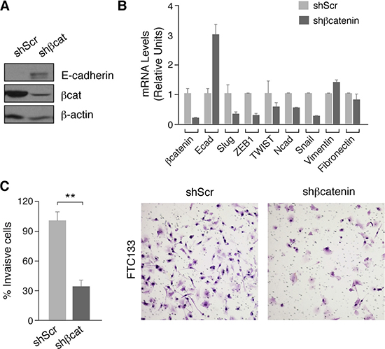 Figure 6: β-catenin silencing decreases expression of EMT markers and inhibits cell migration of human thyroid tumoral cells. (A) FTC133 cells were infected with control (shScr) or β-catenin (shβcat) lentivirus shRNAs. Total protein extracts were analyzed by western blot for the detection of β-catenin and E-cadherin. (B) Expression of selected EMT genes. Data show the relative expression levels compared with the control cells. (C) The invasive capacity of FTC133 control or shβ-catenin cells was analyzed in Matrigel-coated Transwells. Left panel: number of cells invading the lower chamber after 24 h. A total of 10 fields for each cell line were quantified. Values represent means ± SEM (n = 3).**p < 0.01. Right panel: representative images of Transwell filters.