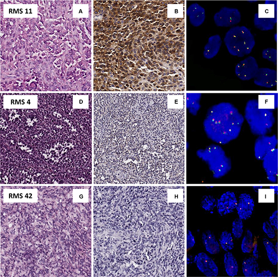 A total of 74 pediatric RMS (28 ARMS and 46 ERMS) from untreated patients aged up to 24 years, with known clinical data at onset and follow-up until July 2014 were retrieved and studied for FISH and IHC analysis. Fifty two cases were recovered from the files of the Department of Diagnostic Pathology and Laboratory Medicine of the Fondazione IRCCS Istituto Nazionale dei Tumori of Milan, and 23 RMS from the Pathology Department of the University Hospital of Padova. The study was approved by the Internal Review Board and the Ethics Committee of both the institutions. All patients gave their written consent for diagnosis and research activities when they were admitted to the hospital.