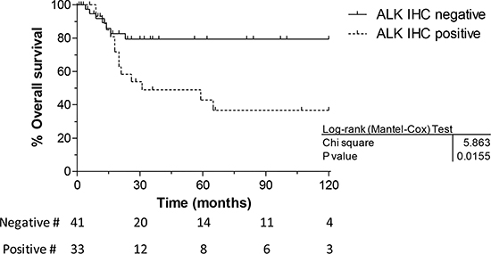 The median follow-up of the case series was 23 months (range 1–250 months), and at the time of the last follow-up date 22 patients were dead. Overall survival (OS) was calculated from date of enrollment to the date of death due to any cause, or censored at the date of last follow-up for living patients. OS was estimated using the Kaplan-Meier method and compared across the groups using the log-rank test. For clinic-pathologic features and ALK expression hazard ratios (HRs) together with 95% confidence intervals (CIs) were estimated by fitting the Cox survival model. Differences were considered statistically significant at p ≤ 0.05.