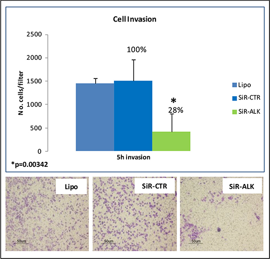 Figure 4: ALK silencing: siRNA-mediated down-modulation of ALK significantly inhibited invasion capability of RH30 cells.