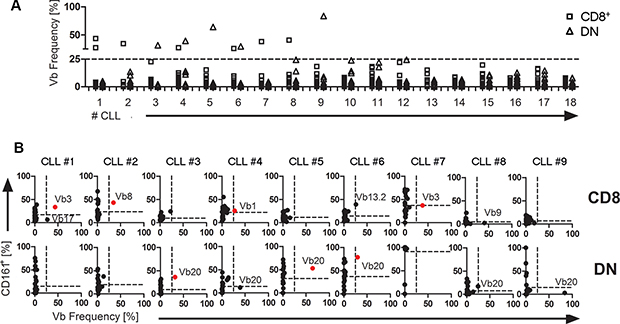 We next investigated whether in line with our results from TCL1 mice, CLL patients exhibit an increased percentage of CD161+ cells within overrepresented T cell clones. We therefore stained peripheral blood lymphocytes from 18 consecutive non-selected CLL patients using CD161 and TCR-Vβ-specific antibodies. In line with our previous results [19], we found that in the peripheral blood of some CLL patients, overrepresented TCR-Vβ-specific T cells could be discerned, reaching up to > 80% occurrence within the peripheral T cell pool (Figure 3A). Using an arbitrary cut-off of ≥ 25% occurence of T cells using a particular Vβ element, we found that from 18 consecutive CLL samples analysed, 9 showed at least one overrepresented CD8+ or DN Vβ-specific T cell fraction. In 7 out of these 9 cases with overrepresented T cells, at least one of the respective T cells exhibited a substantial expression of CD161 which was above the mean CD161 expression levels of all TCR-Vβ-specific T cells (CLL #1–#7; Figure 3, Supplementary Table S1). Among the remaining two samples, one had a dominant DN TCR-Vβ20 fraction at borderline frequency of 24,5% with clear CD161 expression (CLL #8, Figure 3) and only one CLL sample showed a dominant T cell clone without CD161 expression (CLL #9, Figure 3). Strikingly, within the DN T cell fraction, all overrepresented cells expressed the TCR-Vβ20 element (Figure 3B).