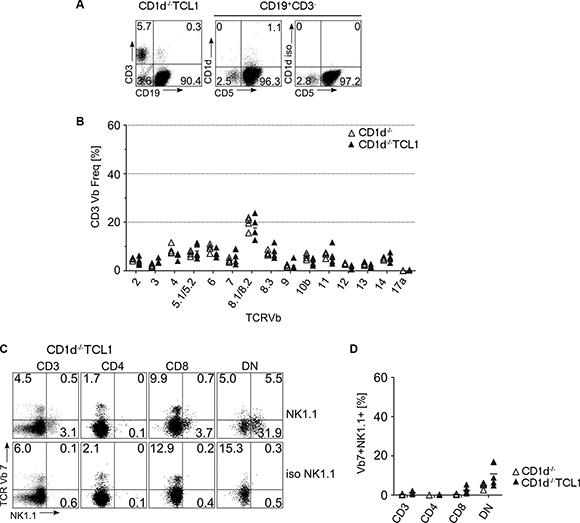 Figure 5: T cell skewing in CD1d knockout mice. (A) CD1d−/− TCL1 mice generate CLL similar to CD1d+/+TCL1 mice. Depicted is a representative FACS stain from a CD1d−/− TCL1 mouse on splenocytes stained for CD3, CD19, CD5 and CD1d. On the middle and right FACS plot, CD5 and CD1d expression of gated CD3-CD19+ cells are depicted. (B) TCR-Vβ usage was determined in CD1d−/− (n = 4) and CD1d−/− TCL1 (n = 5) mice as described for Figure 1. (C, D) CD3+Vβ7+ T cells from CD1d−/− TCL1 mice were further stained for CD4 and CD8 expression and for NK1.1. Representative FACS profiles (C) and graphs (D) are shown. (DN: double negative for CD4 and CD8; iso: staining using an isotype control antibody instead of an anti-NK1.1 antibody). (Horizontal bars indicate mean percentage).