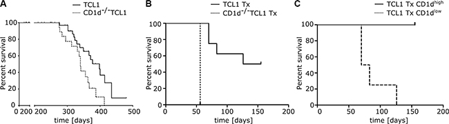 Figure 6: Overall survival in CD1d proficient and deficient TCL1 mice. (A) CLL development was monitored in CD1d+/+TCL1 (n = 47) and CD1d−/− TCL1 (n = 26) mice and overall survival was assessed for both cohorts. (B) Overall survival of wildtype recipient mice transplanted (Tx) with TCL1 and CD1d−/− TCL1 tumors (CD1d−/− TCL1 Tx n = 4 and TCL1 Tx n = 8). (C) Overall survival of wildtype recipient mice transplanted with TCL1 tumors shown in (B; TCL1 Tx). Mice were grouped in two cohorts based on CD1d expression in peripheral blood (TCL1 Tx CD1dhigh n = 4 and TCL1 Tx CD1dlow n = 4) and percent survival was calculated.