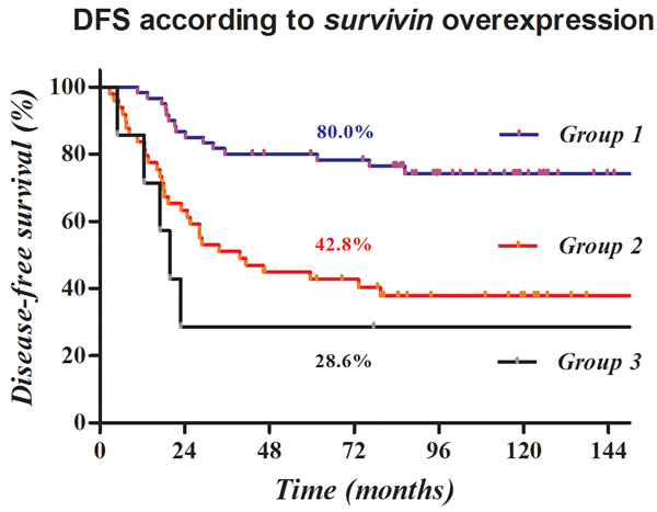 A prognostic model was established on the basis of the molecular marker survivin. Predictive grouping using IHC for cytoplasmic and nuclear survivin was performed according to the following criteria: group 1, no aberrant expression; group 2, one molecular marker showing positivity; and group 3, all markers showing positivity.