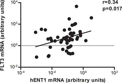 The mRNA amounts of the main nucleoside transporters (NT) and intracellular metabolizing enzymes (ME), hENT1, hENT2 (SLC29A2), hCNT1 (SLC28A1), hCNT2 (SLC28A2), hCNT3 (SLC28A3), DCK and cN-II (NT5C2), were measured in 50 pediatric leukemia cases by RQ-PCR. When correlating FLT3 mRNA levels with all these genes, noticeably, despite the high interpatient variability, a positive correlation was found between FLT3 and hENT1 mRNA levels (Figure 1). Based upon these observations we could hypothesize that samples with high FLT3 mRNA levels would show high Ara-C uptake and probably, a better response to therapy. On the other hand, no significant differences were found between hENT1, hENT2, hCNT1, hCNT2, and hCNT3, DCK and cN-II mRNA expression levels and age, gender, CNS status and WBC count. Nevertheless, a positive correlation between FLT3 and DCK was also observed (Supplementary Figure S1).