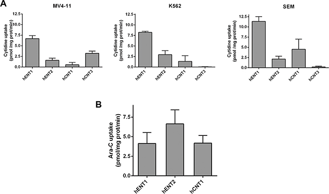 Direct transport of Ara-C by each of the previously identified NTs was determined. Given that the only cell line that retained all the NT-related activities was MV4- 11, we decided to focus on this cell line to study Ara-C transport. We observed that Ara-C was translocated inside cells by hENT1, hENT2 and hCNT1 (Figure 2B).