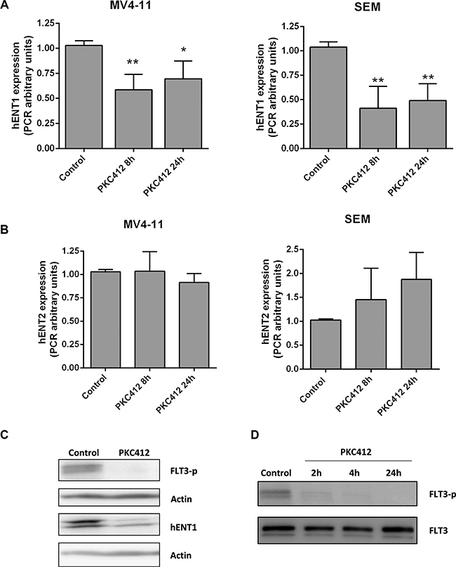 Figure 3: Involvement of FLT3 in hENT1 expression. mRNA expression of (A) hENT1 and (B) hENT2 were assayed by quantitative RQ-PCR in MV4-11 and SEM cells treated for 8 or 24 h with FLT3 inhibitor PKC412 (0.045 μM). Results are based on duplicate measurements from three independent experiments. Western blot for hENT1 (C), FLT3 and phospho-FLT3 (Tyr591) (D) were performed in cell extracts from MV4-11 cells incubated in the presence of PKC412 (0.045 μM) for different periods of time. A representative Western blot of three independent experiments is shown in each panel. Statistical significance denotes significant difference relative to control cells (*p < 0.05; **p < 0.01).