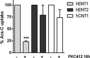 Figure 4: Effect of FLT3 inhibition in the uptake of Ara-C. Direct uptake of [3H]Ara-C (1 μM, 1 min) was measured in MV4-11 cells in the presence of PKC412 for 16 h either in medium containing NaCl or choline chloride. Sodium-dependent transport was calculated as uptake in NaCl medium minus uptake in choline chloride medium. Data are normalized to uptake measured in the absence of PKC412 and expressed as percentage ± SEM from 3 independent experiments, each conducted in quadruplicate. Statistical significance denotes significant difference relative to control cells (***p < 0.001).