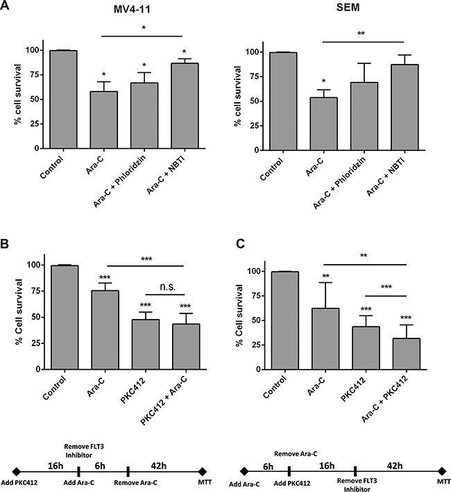 Figure 5: Effect of FLT3 inhibition in the cytotoxicity induced by Ara-C. Cell viability was determined by MTT assays when (A) MV4-11 and SEM cells were cultured with Ara-C (3 μM and 1 μM for MV4-11 and SEM cells respectively) either in the presence or not of NBTI (1 μM) or phloridzin (250 μM) for 48 h; (B) MV4-11 cells were treated with the FLT3 inhibitor PCK412 (16 h), followed by a 6 h exposure to Ara-C (10 μM), and (C) MV4-11 cells were cultured with Ara-C (10 μM) for 6 h, followed by a 16 h exposure to PKC412. Data are expressed as percentage of survival ± SEM of triplicate measurements from six-nine independent experiments. Statistical significance denotes significant difference relative to control cells (*p < 0.1; **p < 0.01; ***p < 0.001) or to Ara-C or PKC412 treated cells as indicated.