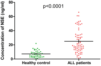 Figure 1: Serum NSE levels in acute lymphoblastic leukemia patients and healthy controls. The mean concentration of NSE for 70 acute lymphoblastic leukemia patients was 25.01 ng/mL, significantly higher than that of the 42 healthy controls (7.187 ng/mL, P< 0.0001).