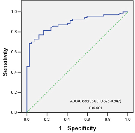 Figure 2: ROC curve analysis of the optimal cutoff point for the serum NSE concentration. The most discriminative cutoff value for NSE was 15.2 ng/mL, with an AUC value of 0.886 (P < 0.001). The sensitivity and specificity were 68.6% and 97.6%, respectively.