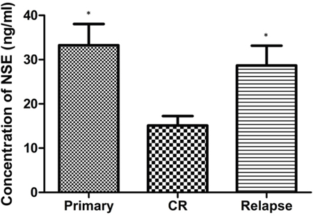 Figure 3: Serum NSE levels of patients at the time of diagnosis, CR, and relapse. *P<0.05, compared with CR.