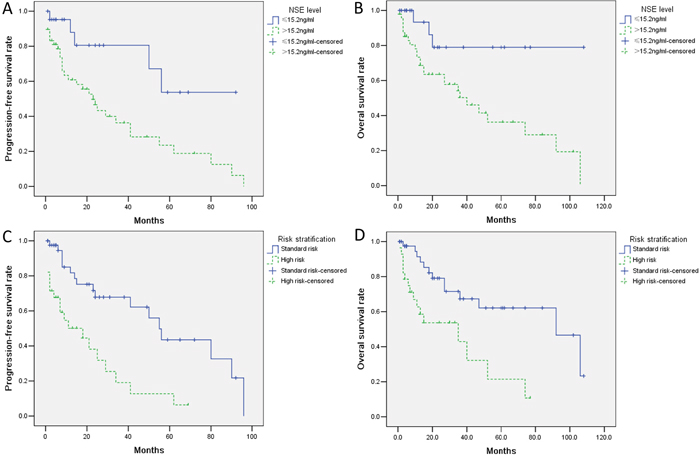 Figure 4: Kaplan-Meier survival analysis for all patients with acute lymphoblastic leukemia. Progression-free survival (PFS) and overall survival (OS) were significantly longer in low-NSE patients (≤15.2ng/mL, A, B.) and standard-risk patients C, D. than in high-NSE and high-risk patients, respectively.