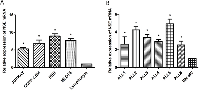 Figure 5: NSE mRNA expression in cell lines and bone marrow cells by real-time PCR analysis. A. The NSE levels were significantly higher in all the ALL cell lines than in normal peripheral blood lymphocytes. *P<0.05, compared with normal peripheral blood lymphocytes. B. The NSE levels were significantly higher in the bone marrow mononuclear cells (BM-MCs) of ALL patients than in healthy controls. *P<0.05, compared with BM-MCs of healthy controls.