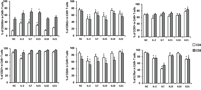 Figure 3: Phenotype of CART cells exposed to different cytokines. Quantitation of CD45RA, CD62L, CCR7, CD27, CD28 and IL7Rα expression in CART cells expanded in the presence of indicated cytokines. Histograms represent mean values ± SEM from 6 independent donors. *P <0.05versus no cytokine (NC) group.