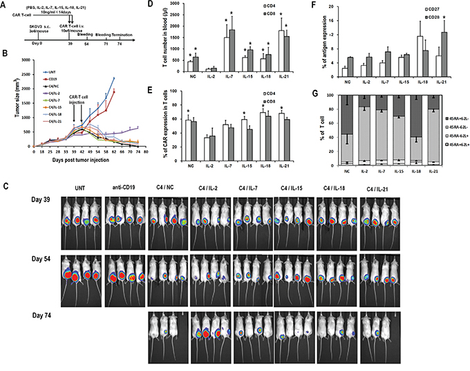 Figure 6: Antitumor activity of various CART cells with previous cytokine exposure. A. In vivo experiment scheme. B. Tumor growth curves of mice treated with C4-27z CART cells, anti-CD19-27z CART cells and untransduced T cells. Data is presented as mean value ± SEM. Arrows indicate the time of T cell infusion. C. Bioluminescence images show fLuc+ SKOV3 tumors in NSG mice immediately before (day 38), two weeks (day 53) and five weeks (day 74) after first intravenous injection of CART cells. D. Quantitation of circulating human CD4+ and CD8+ T cell counts in mice peripheral blood 15 days after the first dose of CART cell infusion. *P<0.05 versus IL-2 group. E. Quantitation of CAR expression on circulating human CD4+ and CD8+ T cells in mice blood. *P<0.05 versus IL-2 group. F. Quantitation of CD27 and CD28 expression on circulating human T cells in mice blood. G. Distribution of T-cell subsets of circulating human T cells in mice blood based on CD45RA and CD62L staining.