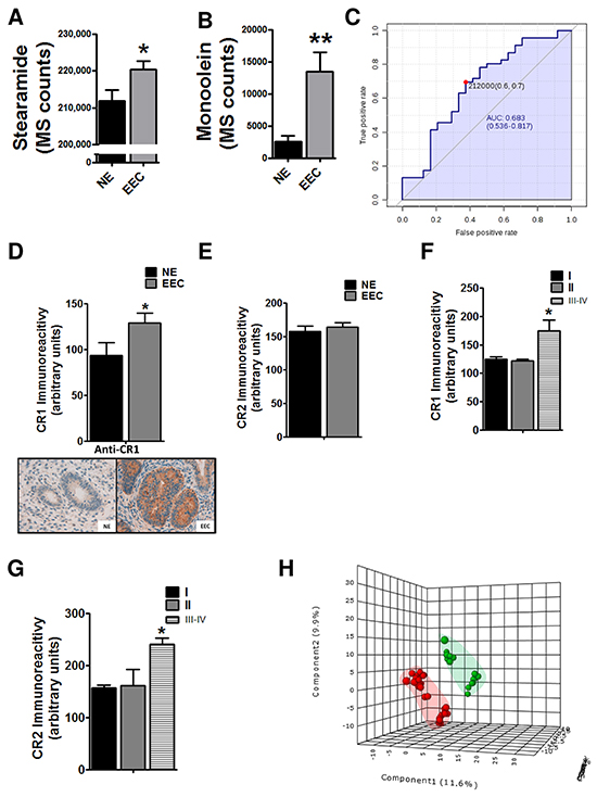 Figure 2: Implication of endocannabinoid pathway in endometrioid endometrial carcinoma (EEC) progression. Levels of cannabinoid related metabolites, the stearamide A. and the monoolein B. are increased in EEC samples. C. Predictive power of stearamide in EEC determination. * P<0.05 D. The levels of cannabinoid receptor 1 (CR1) are increased in ECC tissue samples whereas there are not differences in CR2 levels E. Increased levels of CR1 F. and CR2 G. in stages III-IV of EEC. H. PLS-DA graphs demonstrating different metabolomic profiles in EEC, grades 1-2 and 3. Blue spots represents normal endometrium samples (NE), red spots endometrioid endometrial carcinoma grades 1 and 2 and green spots from endometrioid endometrial carcinoma grade 3. * P<0.05
