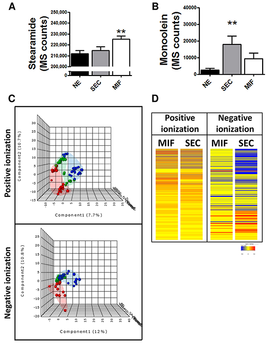 Figure 3: Specific metabolomic profile of tumor cells at the invasive front (MIF) and the cells that are located in the surface of the tumor (SEC). Differential levels of stearamide A. and monoolein B. according to tumor depth. *P<0.05 C. PLS-DA graphs demonstrating different metabolomic profiles. Red spots represents normal endometrium samples, blue spots samples from surface endometrioid carcinoma and green spots from myometrial invasive front.PLS-DA model out of bag error is 0.261 for positive and 0.377 for negative ionization D. Heat map showing the molecular features (see main text for definition) found myometrial invasive front (MIF) and surface endometrioid carcinoma (SEC) in metabolomic analysis. Individual scale maps for heat intensity are shown below each sample type.