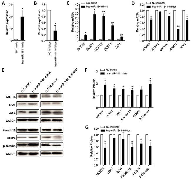 As above mentioned, hsa-miR-184 expression was consistently increased along with RPE differentiation (Figure 1C), we then respectively transfected hsa-miR-184 mimic and inhibitor into hiPSC-RPE at 30 dpd to see its role on cell differentiation. Hsa-miR-184 mimic comprises chemically synthesized oligonucleotides identical to the sequence of endogenous hsa-miR-184, which will be loaded into the RNA-induced silencing complex (RISC) and silence target genes like endogenous hsa-miR-184 [25]. Antisense hsa-miR-184 oligonucleotides are used as hsa-miR-184 inhibitor, which binds directly to the single strand mature hsa-miR-184 to block its activity [26]. Exogenous hsa-miR-184 expression was remarkably up-regulated in cells transfected with hsa-miR-184 mimic (Figure 3A), and endogenous hsa-miR-184 expression was down-regulated in cells transfected with hsa-miR-184 inhibitor (Figure 3B). Expressions of several RPE markers were then tested, including mRNA expressions of RPE65, RLBP1, MERTK, BEST1 and TJP1, and protein expressions of MERTK (encoded by MERTK; NP_006334), lecithin retinol acyltransferase (encoded by LRAT, NM_004744; NP_004735), ZO-1 (encoded by TJP1; NP_003248), keratin type I cytoskeletal 18 (encoded by KRT18, NM_000224; NP_000215), RLBP1 (encoded by RLBP1; NP_000317), and β-catenin (encoded by CTNNB1; NP_001895). Ectopic hsa-miR-184 overexpression elevated both mRNA and protein expressions of the RPE markers (Figures 3C, 3E-3F), while hsa-miR-184 insufficiency suppressed their expressions (Figures 3D, 3E, and 3G). Our findings suggested that hsa-miR-184 promotes the differentiation of hiPSC-RPE.