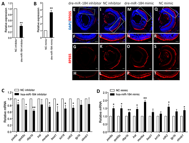 Figure 4: Dre-miR-184 promotes retinal development in vivo. A-B. Relative expression of dre-miR-184 in zebrafish injected with dre-miR-184 inhibitor compared to NC inhibitor (A), and in embryos injected with dre-miR-184 mimic compared with NC mimic (B). C-D. Relative mRNA expressions of pax6a, rpe65c, rlbp1b, lrat, mertka, best1, krt18, cdh2, tjp1b, and ctnnb1 in zebrafish injected with dre-miR-184 inhibitor compared to NC inhibitor (C), and in embryos injected with dre-miR-184 mimic compared with NC mimic (D). *: p<0.05; **: p<0.01.
