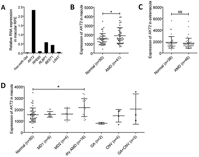 Since hsa-miR-184 was reported to present a decreased expression pattern in AMD patients, we next tested and compared the macular and extramacular AKT2 mRNA levels in RPE-choroid from normal individuals and AMD patients. Summary mRNA data (GSE29801) and sample information (GSM738433 to GSM738607) of 175 independent RPE-choroid samples were downloaded from Gene Expression Omnibus (GEO) datasets and double-checked. The 175 samples contained 50 macular and 38 extramacular RPE-choroid tissues from normal individuals, and 41 macular and 46 extramacular RPE-choroid samples from AMD patients. AKT2 was found elevated in the macular RPE-choroid of AMD patients compared to healthy controls (Figure 7B), while no expressional difference between the two groups was detected in the extramacular RPE-choroid (Figure 7C). Subgroup analysis was next performed to better tell with which AMD subtype AKT2 is most closely correlated. Clinical diagnostic criterion for each AMD subgroup has been detailed before [31]. According to our findings, AKT2 was only found elevated in the dry AMD group (n=16) (Figure 7D), a branch of atrophic AMD. Our results implied a potential role of AKT2 in atrophic AMD.