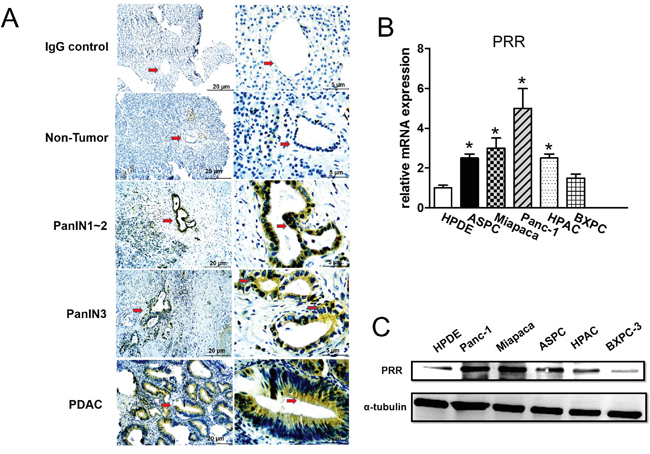 PRR is highly expressed in human pancreatic intraepithelial neoplasia (PanIN) lesions, PDAC, and human pancreatic cancer cell lines