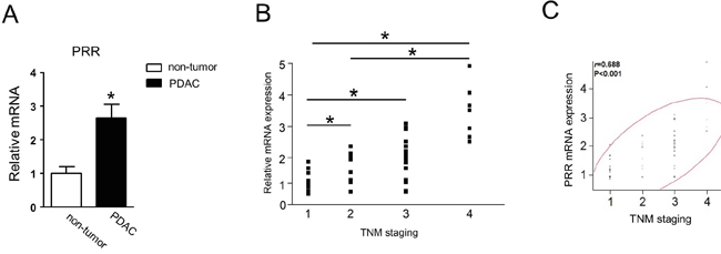 Figure 2: Human PRR is strongly expressed in PDAC and correlates with TNM staging. A. Human PRR was 2.5-fold expressed in PDAC (n=90). B. human PRR expression was along with TNM staging (n=90). C. human PRR expression was positively associated with TNM staging. Data are means ± SEM. *, p<0.05 vs. non-tumor cells.