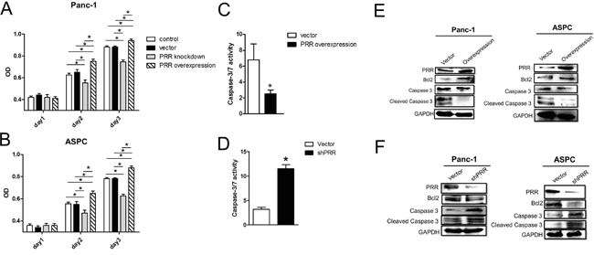 Figure 3: Effects of overexpression and downregulation of PRR on Panc-1 and ASCP cells in cell proliferation and apoptosis. A and B. Cell proliferation was analyzed by MTT assay in overexpression or knockdown of human PRR in Panc-1 and ASCP cells compared to control vector (n=6). Results shown are shown the mean growth ± SEM. C and D. caspase 3/7 activity was investigated in in overexpression or knockdown of human PRR in Panc-1 and ASCP cells compared to control vector (n=5). E and F. Apoptosis biomarkers, Bcl2, caspase 3 and cleaved caspase 3, was measured by western blot analysis in overexpression or knockdown of human PRR in Panc-1 and ASCP cells compared to control vector. Data are means ± SEM. *, p<0.05 vs. control vector.