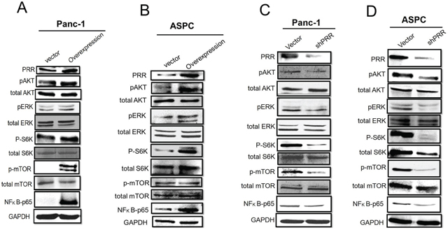 Figure 4: Role of PRR in MAPK and PI3K/Akt pathways. Western results have shown in A. overexpression of human PRR in Panc-1 cells, B. overexpression of human PRR in ASPC, C. knockdown of human PRR in Panc-1cells, and D. knockdown of human PRR in ASPC cells.